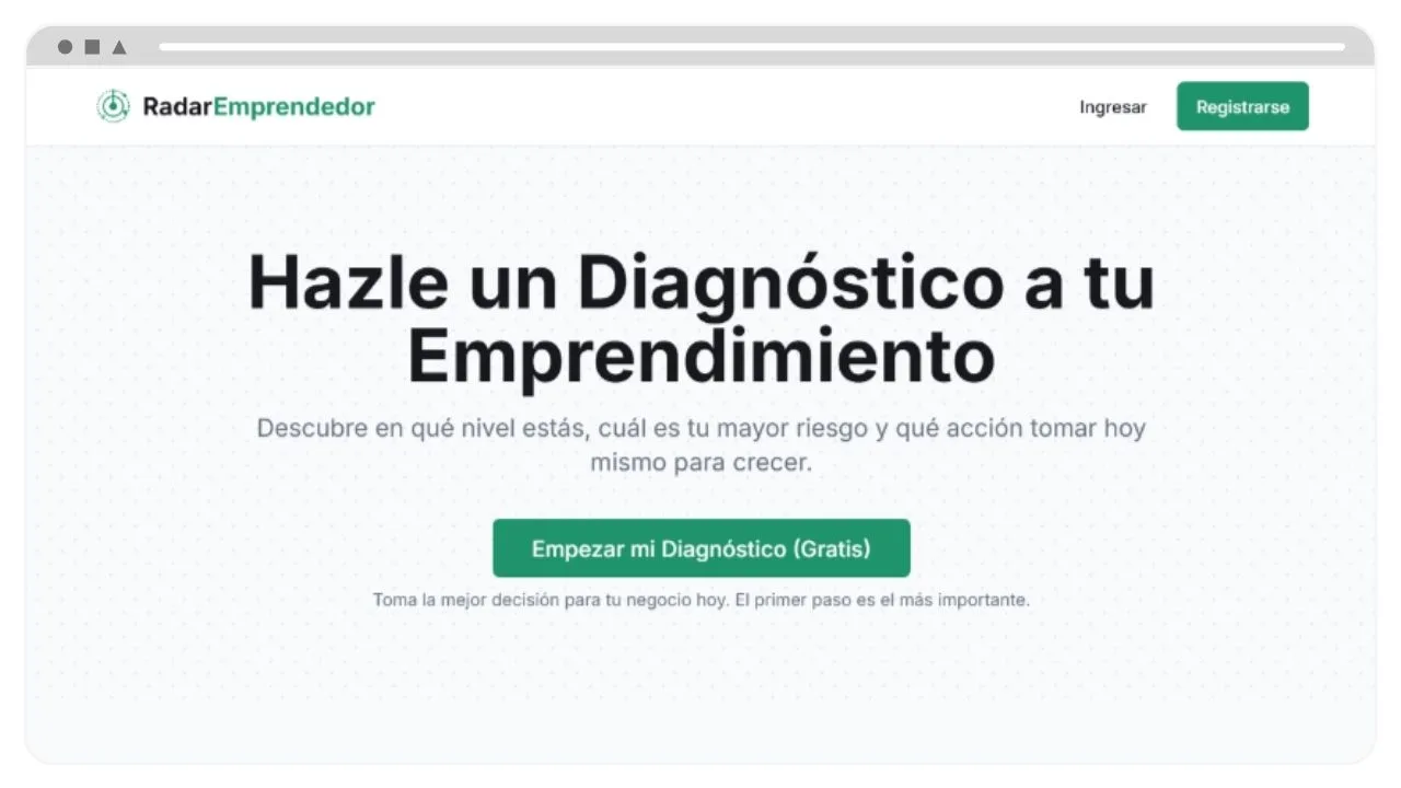 Radar es una plataforma digital diseñada para analizar, diagnosticar y guiar a emprendedores en el camino de fortalecer sus negocios. Funciona a través de un cuestionario sencillo que cubre las áreas clave de cualquier emprendimiento: